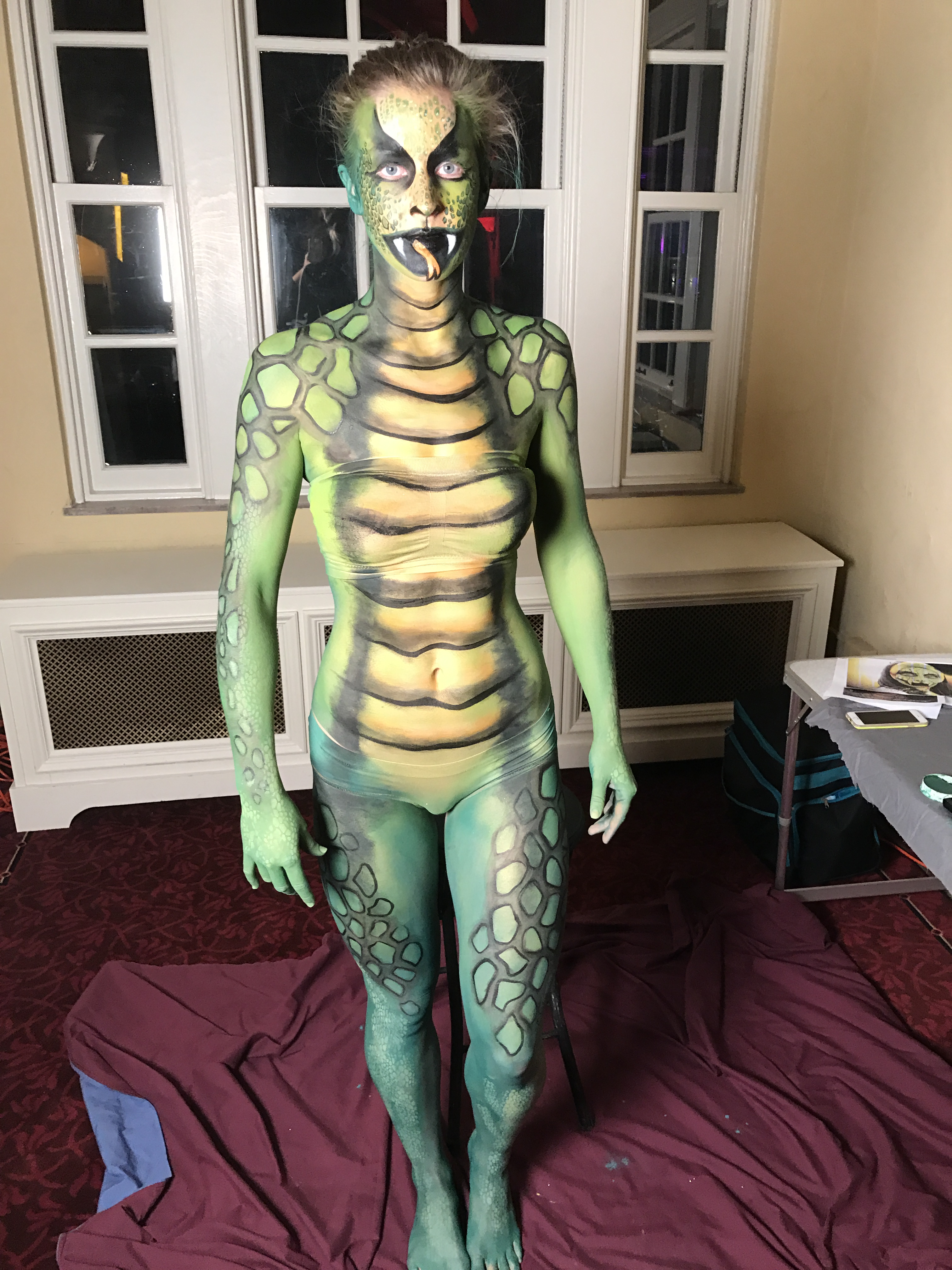 Unlike tattoo and other forms of permanent body art, body painting is temporary, painted onto the human skin, and lasts for one day, or at most (in the case of Mehndi, "henna" or temporary tattoo, glitter tattoos) a couple of weeks. Some body paintings can last beyond one day depending on the type of paint being used. Our paints are always 100% non-toxic and safe for skin. They are high performance makeup based paints with super high quality pigments.